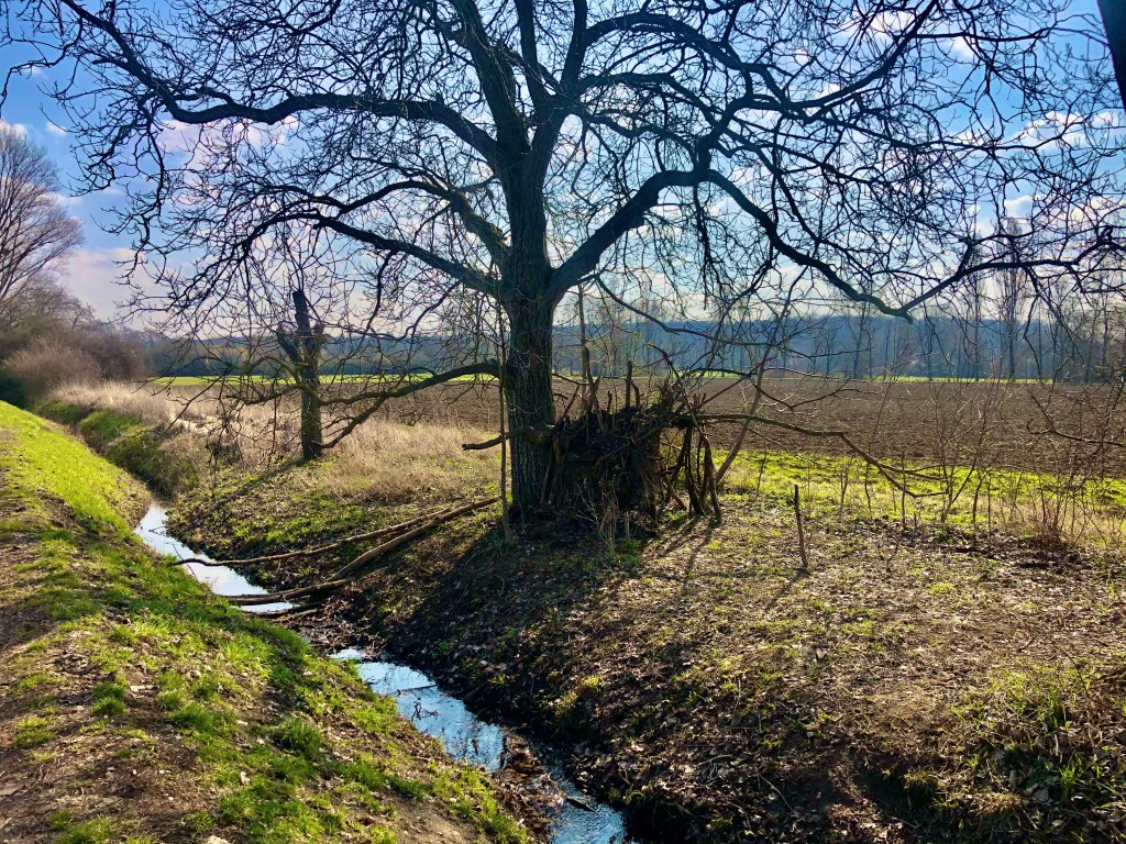 Die Sonne scheint, ein kühler Frühlingsluft zieht durch meine Radjacke. Meine Klingel hat sich festgedreht und tönt nach ein paar Handgriffen endlich wieder im Fahrtwind. Da entdecke ich dieses Bretter-Schloss am Wegesrand. Eine Erinnerung an die Jugend. Das Staudammbauen im „Wälde“. Jeden Tag ein anderer Ort im Kopf. Einmal war es ein Raumschiff, dann wieder ein Flugzeug oder ein Baumhaus, eine Jägerhütte oder Schnitzrefugium. Tagelang hauten wir Stöcke gegen Bäume (keiner wusste warum, war einfach schön), bauten „Lägerle“, im Hinterkopf „Die Schatzinsel“ oder „Tom Sawyer“ – der kleine Bach war der Mississippi. Die Initialen meiner damaligen Geliebten ( Zeitraum < 1 Woche) stehen bestimmt heute noch in den Bäumen.