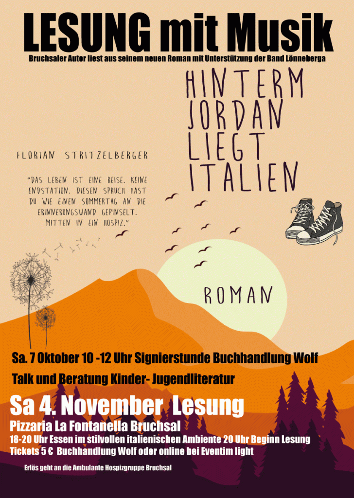 Am 4. November lese ich mit einigen Gästen in der Pizzeria La Fontanella in Bruchsal. Doch nicht nur das. Zusammen mit meiner Band Lönneberga gibt es ein paar Songs, die ich extra für das Buch geschrieben habe. Es gibt Gastauftritte von Freunden und bestimmt wird dies ein wundervoller Italo-Abend mit Kultur, Musik, gutem Wein und super Essen. Das Ganze findet im gemütlichen Gewölbekeller der Pizzaria statt. Ihr könnt ganz entspannt von 18-20 Uhr essen und ab 20 Uhr beginnt die musikalische Lesung. Der ganze Erlös geht an die Hospizhilfe in Bruchsal. Tickets gibt es bei der Buchhandlung Wolf oder online hier bei Eventim. Hier geht es zu den Tickets. Die Lönnis und ich freuen uns wirklich auf einen super Abend!