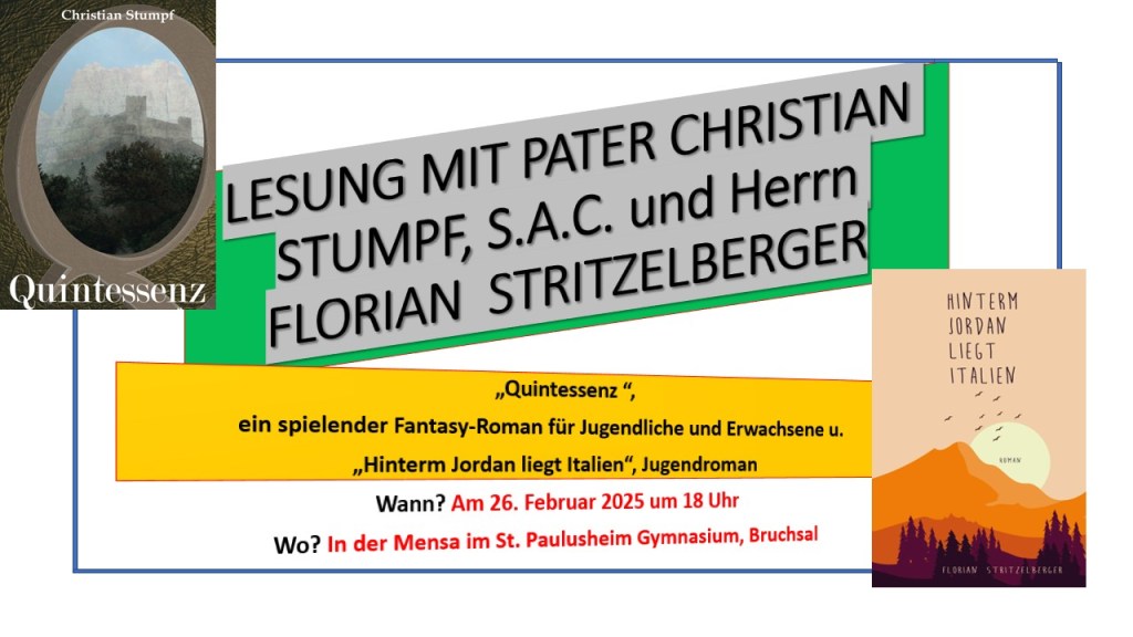 am 26 Februar kehre ich zurück in alte Hallen aus vergangenen Schultagen. Als Schüler besuchte ich bereits da Gymnasium St.Paulusheim und darf nun zusammen mit Pater Stumpf ( ehemaliger Schulseelsorger)eine Lesung halten. Er ist ebenfalls Autor und schreibt Fantasyromane für Kinder und Jugendliche. Los geht das Ganze um 18 Uhr. Der EIntritt ist natürlich frei! Wir freuen uns auf viele, bekannte Gesichter aus der Paulusheim-Verbindung, aber auch auf gänzlich neue Zuhörer. Das Ganze findet in der Mensa der St.Paulusheim Gymnasium in Bruchsal statt.