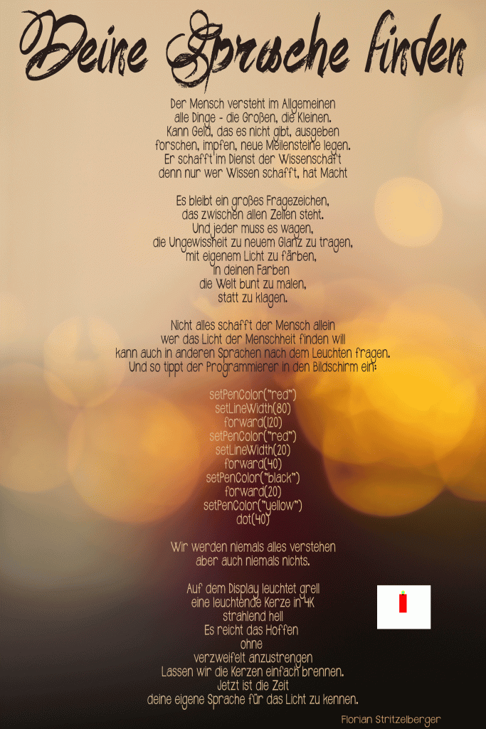 Was ein Jahr. Zu Weihnachten ein kleines Gedicht, was meine momentane Stimmug auf den Punkt bringt. Sich treiben lassen, vertrauen in die Wissenschaft haben, dass wir das alles in den Griff bekommen und um den Rest muss ich mich nicht kümmern. Was der Faktor X ist, sei jedem selbst überlassen. Aber wir müssen lernen mit Ungewissheit umzugehen. Deshalb. Findet eure Sprache. Putzt, backt,kocht,programmiert, zockt, schreibt,spielt,lauft,rechnet,langweilt,chillt oder wuselt in eurer Sprache zum Licht und leuchtet ! Frohe Weihnachten !